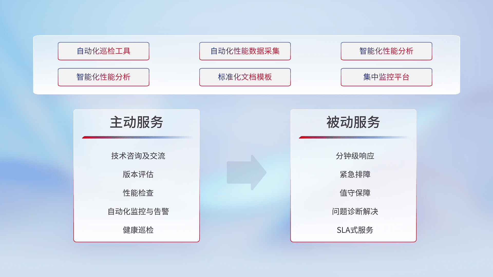 智能化工具和标准化文档,,,保障服务质量,,,,提供主动服务(包含技术咨询、、、、版本评估、、、性能检查、、、、自动化监控与告警、、健康巡检)和被动服务包含(分钟级响应、、紧急排障、、、、值守保障、、、、问题诊断解决、、、SLA服务)。。。